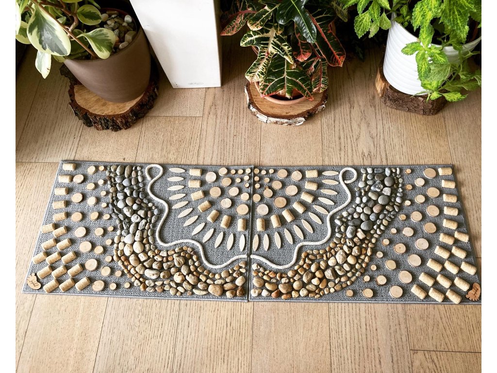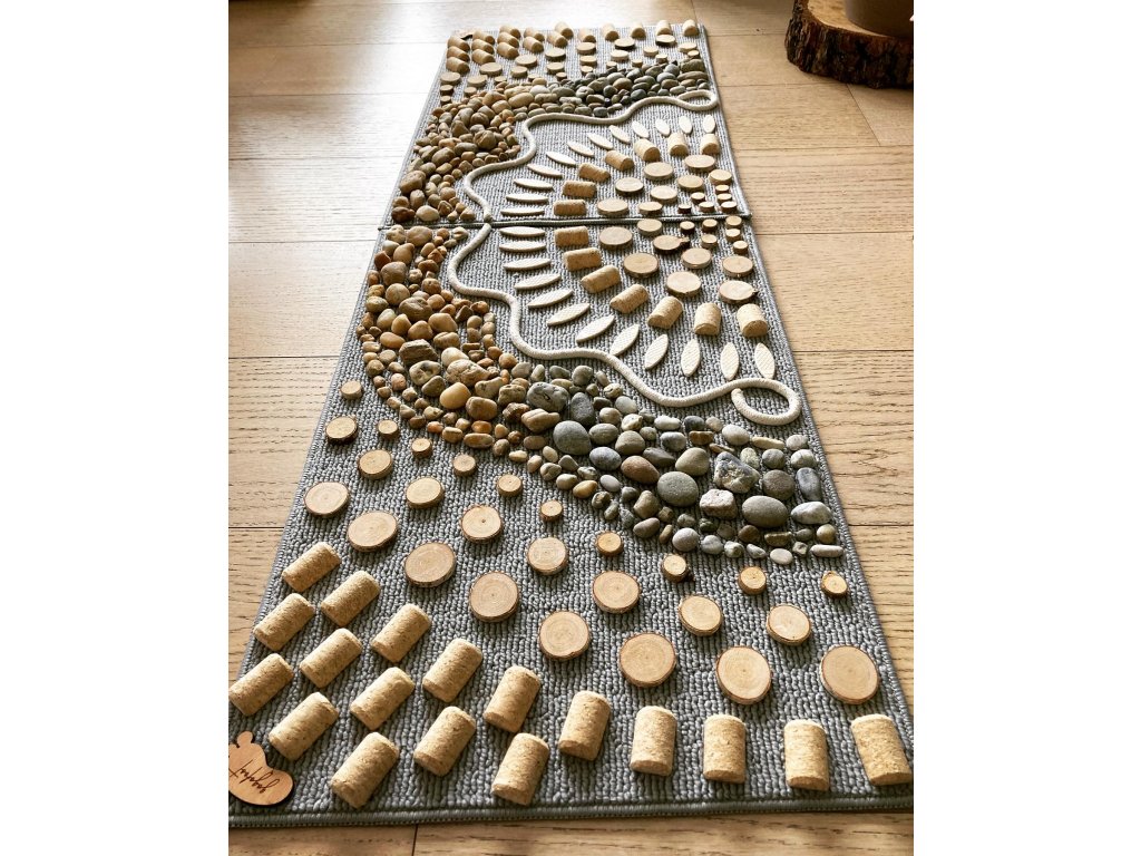 Senzomotorický koberec Infinity má šedý podklad a je cíleně vymyšlený tak, aby na sebe navazoval a byl tak delší, větsí apod.